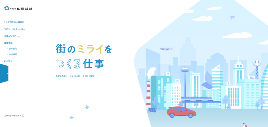 建築や土木の設計・調査を手がける総合建設コンサルタント会社の採用サイト。青をベースに赤をアクセントとしたロゴマークのコーポレートカラーを軸にデザインされています。