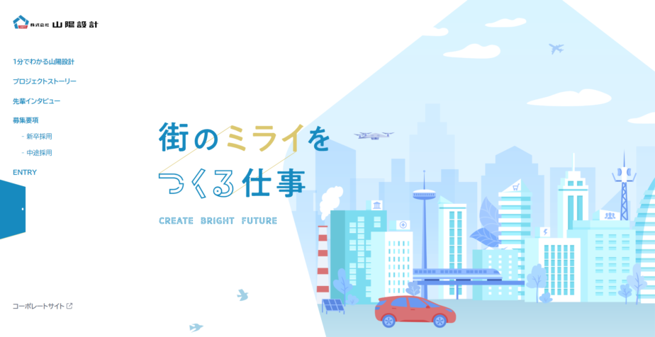 建築設計やまちづくりに関わる事業を行う企業の採用サイトです。建築や土木、都市デザインなどに関心のある学生や求職者を主なターゲットとしています。