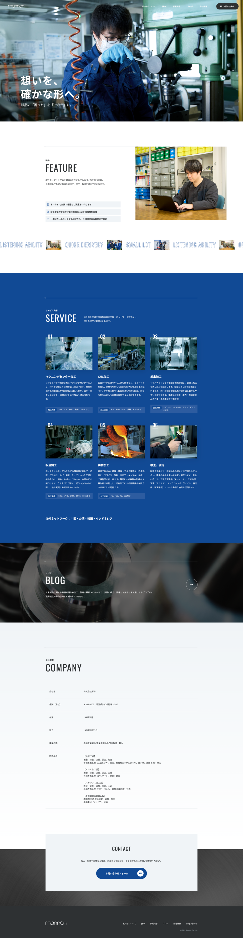 また、情報発信の場としてブログも設置。工業製品に関する基礎知識から、加工・製造の最新トピックまで幅広く発信できるホームページとしました。専門性と信頼感をしっかりと備えながら、お問い合わせへとスムーズにつながるサイトに仕上げました。